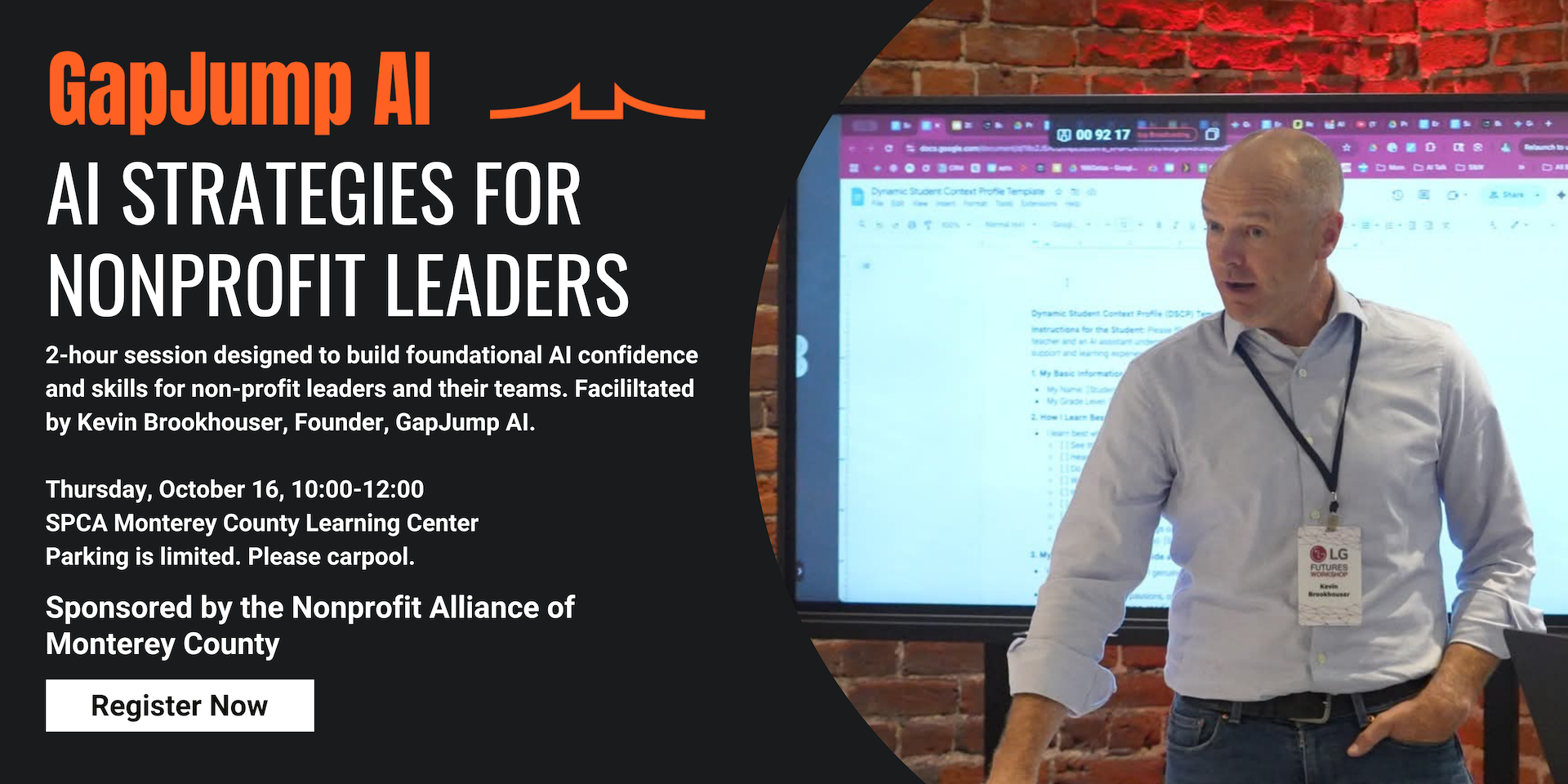 Workshop ProviderKevin Brookhouser, Founder & Lead Consultant of GapJump AI, & a technology expert passionate about supporting the nonprofit sector.